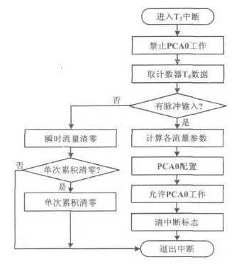 T0被設(shè)置為脈沖下降沿計(jì)數(shù)模式,以對(duì)流量脈沖信號(hào)進(jìn)行計(jì)數(shù),16位定時(shí)器T3用于設(shè)置查詢(xún)周期。一旦查詢(xún)周期到達(dá),系統(tǒng)將響應(yīng)中斷并讀取T3中斷內(nèi)的T0計(jì)數(shù)值,從而計(jì)算瞬時(shí)流量、單個(gè)累積流量和總累積流量。