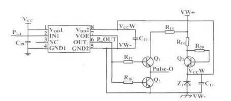 由于用戶通常提供DC12 V或DC24 V電源,穩(wěn)壓器Z1用于穩(wěn)定5 V電壓,以便向光耦合器的另一端供電。脈沖輸出電路如圖3所示。在圖3中,VW+和VW-是用戶提供的外部DC12 V或DC24 V電源輸入端,Q1和Q2是三端。在脈沖輸出過(guò)程中,當(dāng)P1.4和P_OUT處于高電平時(shí),Q1導(dǎo)通,Q2截止,節(jié)點(diǎn)脈沖輸出處于高電平。當(dāng)P1.4和P_OUT為低電平時(shí),Q1關(guān)閉,Q2開(kāi)啟,節(jié)點(diǎn)脈沖輸出為低電平。